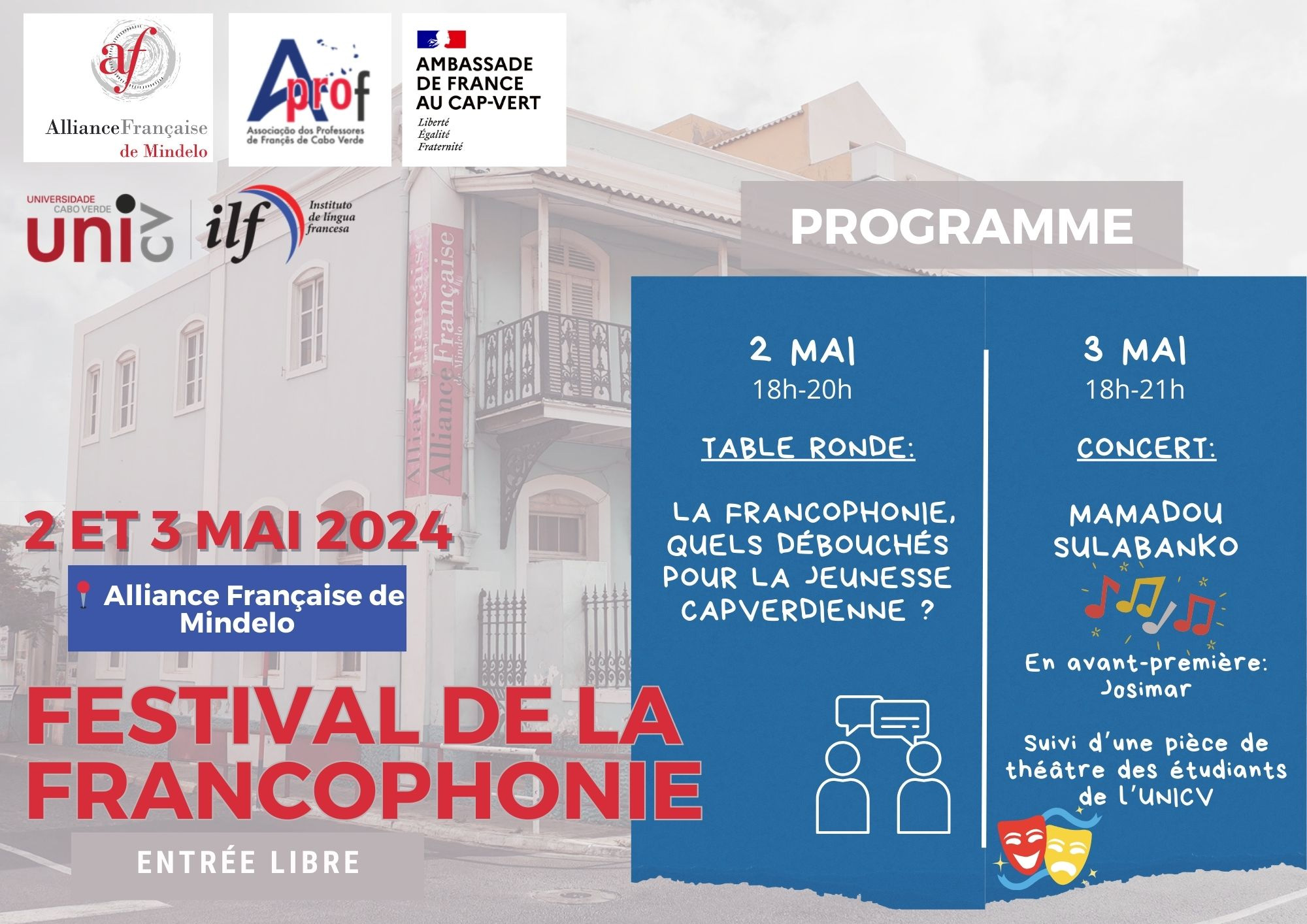 L’Alliance Française de Mindelo (AF), en partenariat avec l’Ambassade de France au Cap-Vert, l’Association des Professeurs de Français du Cap-Vert et l’Institut de la Langue Française, a le plaisir de vous inviter à la première édition du Festival de la Francophonie qui se tiendra dans les locaux de l’AF de Mindelo les 2 et 3 mai 2024 de 18h00 à 21h00.